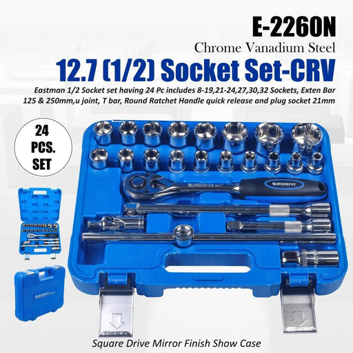 View full detailsEastman (12.7)1/2" Drive 24-Pcs Socket Set with Blow Mold Case, Mirror Finish, Knurled Sockets, Heavy-Duty Ratchet Handle, Ideal for Automotive Use (E-2260N)