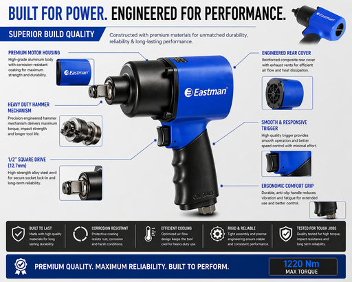 Buy heavy duty impact wrench online at the best price in India from Eastman. Choose from powerful impact wrenches delivering 350Nm to 2100Nm torque, ideal for automotive, workshop, and industrial use. Durable performance, reliable quality, and fast delivery across India. Buy now.