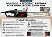 Feature Specification Power 1600W High-Efficiency Motor Input Voltage 200V / 50Hz Chain Speed 600m/min (No Load) Guide Bar Length 400mm (16") Brand Eastman - JRS DRIVE